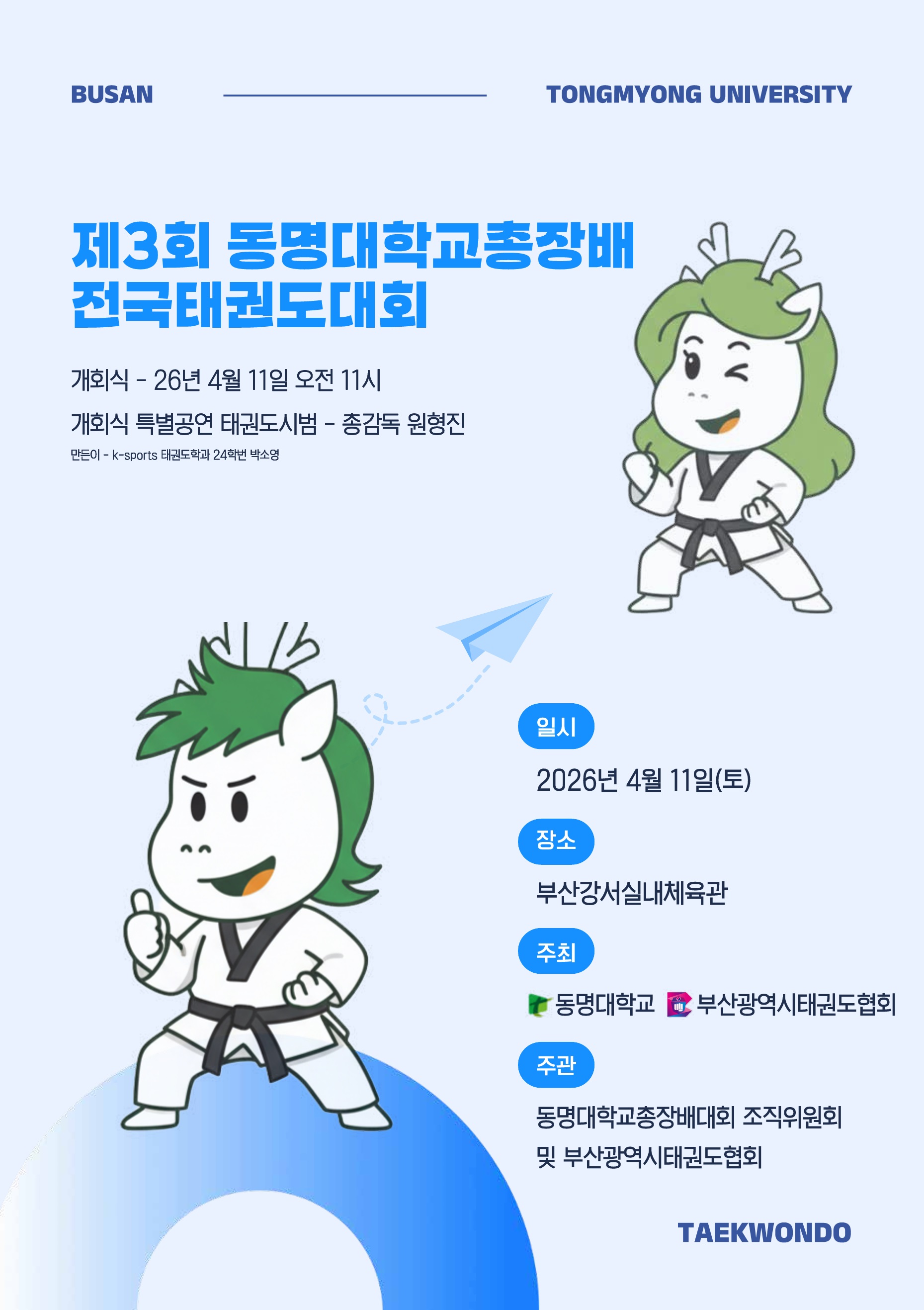 - [대회개최알림] 제3회 동명대학교총장배 전국태권도대회 개최 알림(선착순 접수)