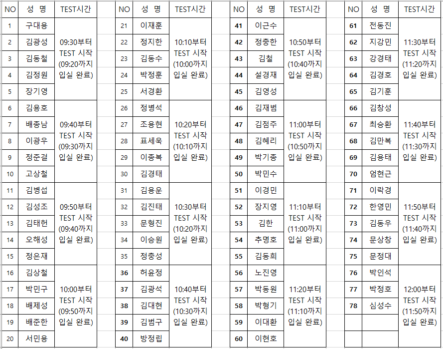 <심사평가위원 테스트 일정>- 일시 : 2026. 2. 5(목) 09:30~12:00- 장소: 양정모체육관 내 1층 태권도훈련장- 테스트 품새: 태극7장, 고려* 도복으로 환복한 상태로 해당 시간까지 입실 완료하시기 바랍니다.* 부상 등으로 부득이하게 테스트가 어려운 경우 진단서, 수술확인서 등을 제출하여야 하며, 부득이한 경우라고 인정될 경우는 해당 인원에 대하여 별도의 일정으로 테스트 함.<심사평가위원 테스트 명단>